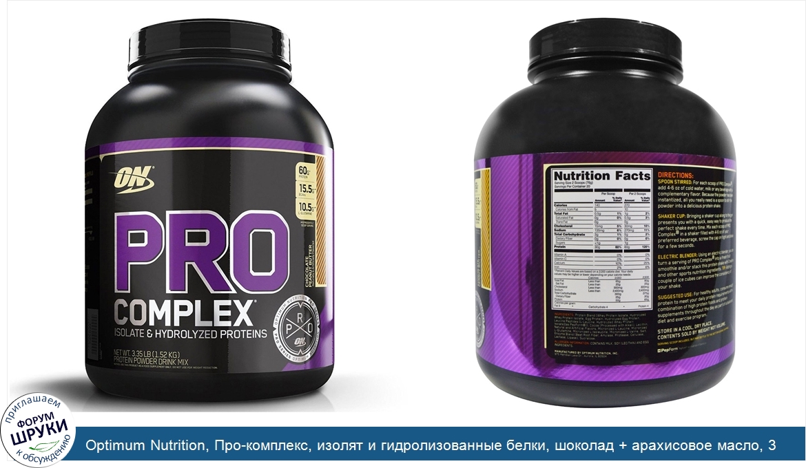 Optimum Nutrition, Про-комплекс, изолят и гидролизованные белки, шоколад + арахисовое масло, 3,35 фунта (1,52 кг)