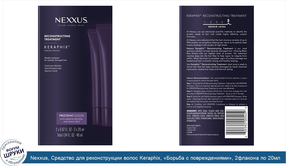 [DESCRIPT]Nature Science Salon. Weekly Treatment for Severely Damaged Hair. Clinically Proven Smoothness and Healthy Look. ProteinFusion with Keratin Protein and Black Rice. Repair Level 5. At Nexxus, we use advanced scientific methods to identify the protein needs of hair and create highly effective, custom formulas. At Nexxus, we understand that the hair structure consists of up to 90% protein, so we believe helping hair return to its optimal state means treating it with protein at high levels. Nexxus Keraphix™ Reconstructing Treatment is our most precious solution to treat severely damaged hair. Infusing Black Rice Extract with our highly level of protein, this treatment reaches deep into the hair fiber to help repair its integrity from within. When the ritual is complete, signs of surface damage are healed and hair is smooth, strong and healthy-looking.[/DESCRIPT]... (описание дополняется)