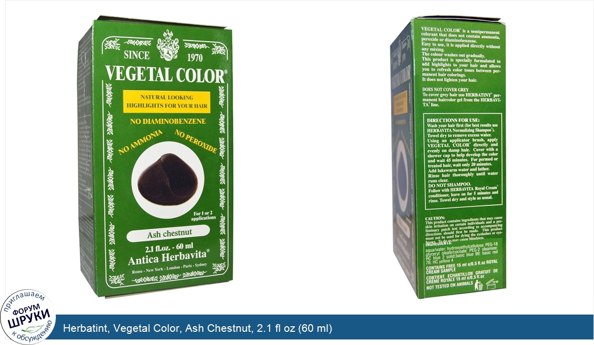 Друзья, если у вас есть отзыв/дополнение/комментарий/вопрос относительно Herbatint, Vegetal Color, Ash Chestnut, 2.1 fl oz (60 ml) - напишите его ответом в эту тему (это будет полезно всему сообществу в целом и вам в отдельности).