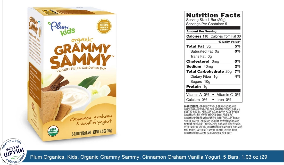 Друзья, если у вас есть отзыв/дополнение/комментарий/вопрос относительно Plum Organics, Kids, Organic Grammy Sammy, Cinnamon Graham Vanilla Yogurt, 5 Bars, 1.03 oz (29 g) Each - напишите его ответом в эту тему (это будет полезно всему сообществу в целом и вам в отдельности).