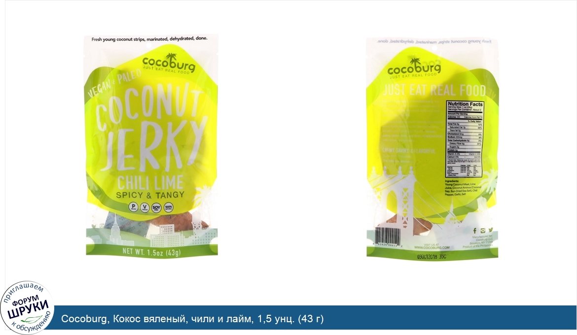 Друзья, если у вас есть отзыв/дополнение/комментарий/вопрос относительно Cocoburg, Кокос вяленый, чили и лайм, 1,5 унц. (43 г) - напишите его ответом в эту тему (это будет полезно всему сообществу в целом и вам в отдельности).