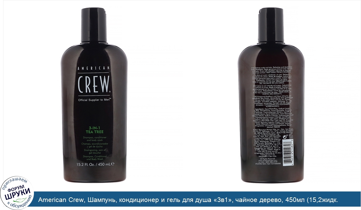 American Crew, Шампунь, кондиционер и гель для душа «3в1», чайное дерево, 450мл (15,2жидк. унции)