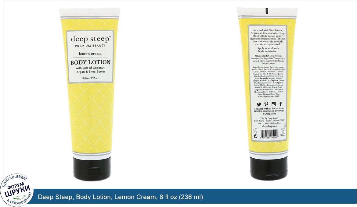 Друзья, если у вас есть отзыв/дополнение/комментарий/вопрос относительно Deep Steep, Body Lotion, Lemon Cream, 8 fl oz (236 ml) - напишите его ответом в эту тему (это будет полезно всему сообществу в целом и вам в отдельности).