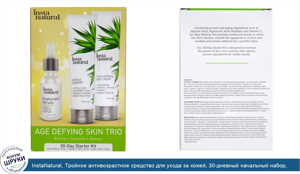Друзья, если у вас есть отзыв/дополнение/комментарий/вопрос относительно InstaNatural, Тройное антивозрастное средство для ухода за кожей, 30-дневный начальный набор, сыворотка и крем, 3 шт. - напишите его ответом в эту тему (это будет полезно всему сообществу в целом и вам в отдельности).