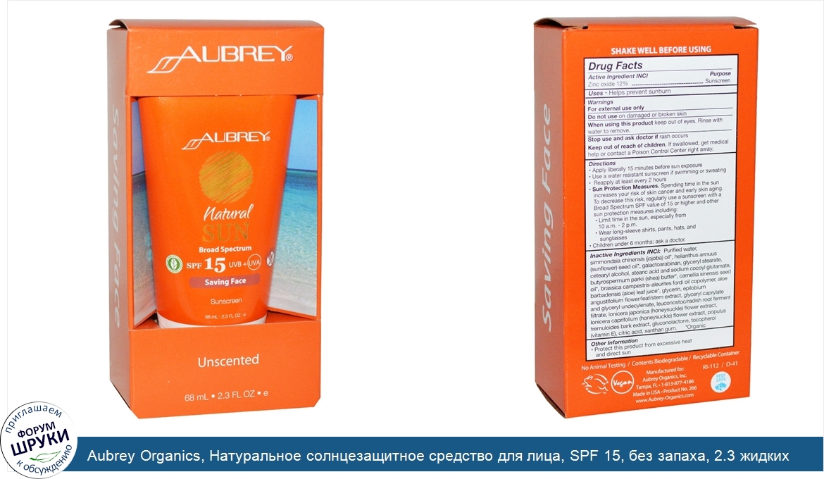 Друзья, если у вас есть отзыв/дополнение/комментарий/вопрос относительно Aubrey Organics, Натуральное солнцезащитное средство для лица, SPF 15, без запаха, 2.3 жидких унции (68 мл) - напишите его ответом в эту тему (это будет полезно всему сообществу в целом и вам в отдельности).