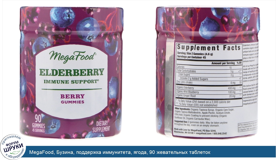 [DESCRIPT]45 порций. Пищевая добавка. Сертифицированная благотворительная корпорация. Без следов глифосата. Продукт протестирован на отсутствие более 125 пестицидов и гербицидов. Отсутствие глютена подтверждено сертификатом Национального научного фонда США. Сертифицированный веганский продукт. Не содержит молочных продуктов. Не содержит сои. Elderberry Immune Support содержит органическую бузину, обеспечивая уникальный вкус и поддержку иммунной системы с помощью силы растений, а цинк играет жизненно важную роль в иммунной реакции организма. Все жевательные конфеты MegaFood изготовлены из настоящих продуктов питания, поставляя в организм широкий спектр полезных для здоровья веществ, без содержания высокофруктозного кукурузного сиропа, желатина и каких-либо искусственных ароматизаторов, красителей и консервантов.[/DESCRIPT]... (описание дополняется)