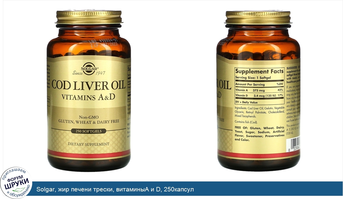Друзья, если у вас есть отзыв/дополнение/комментарий/вопрос относительно Solgar, жир печени трески, витаминыA и D, 250капсул - напишите его ответом в эту тему (это будет полезно всему сообществу в целом и вам в отдельности).