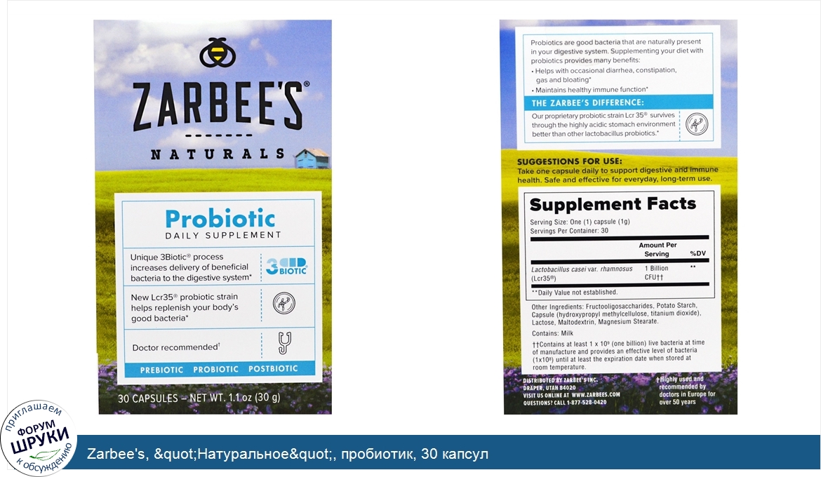 [DESCRIPT]Daily Supplement. Prebiotic - Probiotic - Postbiotic. Probiotic Daily Supplement. Unique 3Biotic process increases delivery of beneficial bacteria to the digestive system. New Lcr35 probiotic strain helps replenish your body's good bacteria. Doctor recommended†. Probiotic. Clinical research indicates that over 70% of your immune system is regulated in the digestive system to maintain balance, a healthy immune system and overall health. Probiotic are most effective if they are alive when they arrive in your digestive tract. Zarbee's proprietary 3Biotic formula allows our unique strains, Lcr35, to survive through the highly acidic stomach environment better than other lactobacillus probiotics. Probiotic are good bacteria that are naturally present in your digestive system. Supplementing your diet with probiotics provides many benefits:. Helps with occasional diarrhea, constipation, gas and bloating. Maintains healthy immune function. The Zarbee's Difference:. Our proprietary probiotic strain Lcr 35 survives through the highly acidic stomach environment better than other lactobacillus probiotics. Zarbee's Story. Dr. Zak Zarbock, a physician and father couldn't find effective chemical-free products to keep the whole family healthy, so he created his own products, including handpicked natural ingredients, whenever possible. The result is Zarbee's Naturals. Our proprietary line of probiotics are naturally sourced and uniquely processed to help maintain balance in the digestive system. As part of your healthy routine, Zarbee's Probiotic will help to support a healthy digestive system- the gateway to a healthy you! †Highly used and recommended by doctors in Europe for over 50 years.[/DESCRIPT]... (описание дополняется)