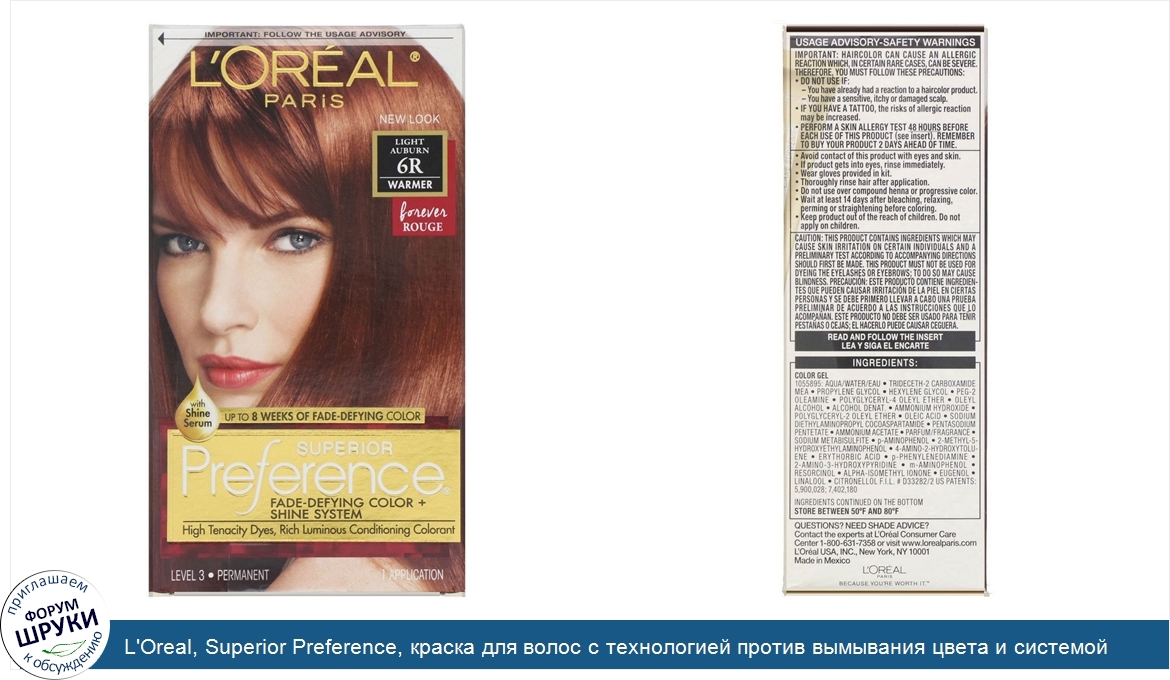 Друзья, если у вас есть отзыв/дополнение/комментарий/вопрос относительно L'Oreal, Superior Preference, краска для волос с технологией против вымывания цвета и системой придания сияния, теплый оттенок, светло-каштановый6R, на 1применение - напишите его ответом в эту тему (это будет полезно всему сообществу в целом и вам в отдельности).