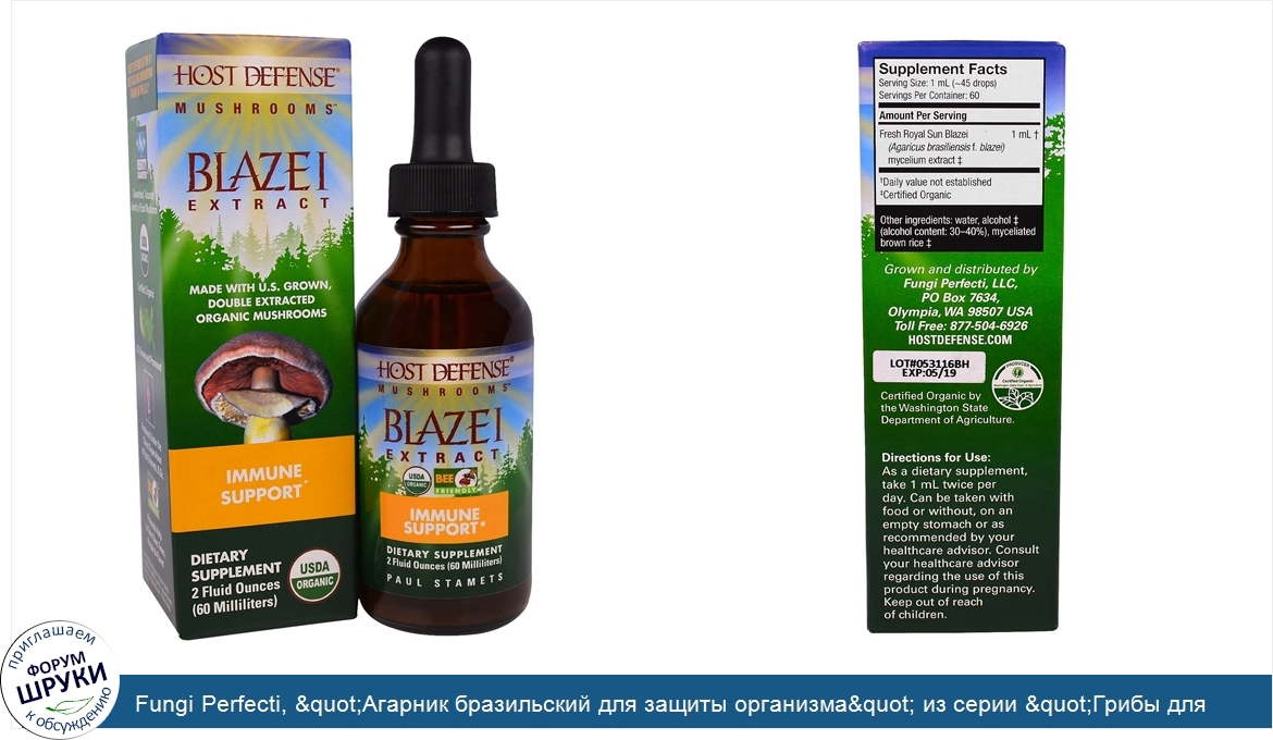 [DESCRIPT]Произведено из выращенных в США, дважды экстрагированных органических грибов. Пищевая добавка. Органическое происхождение подтверждено Министерством сельского хозяйства США. Сертифицировано как органический продукт Департаментом сельского хозяйства штата Вашингтон. Из леса на нашу ферму, а затем к вам. Эти жидкие экстракты обеспечивают быстрое всасывание и отлично подходят для тех, кто нуждается в поддержке иммунитета. Экстракты Host Defense могут использоваться самостоятельно, либо в растворенном виде в воде, теплом чае, кофе, соке или смузи. Агарик Host Defense. Этот потрясающий гриб сравнительно редко встречается в природе и растет только в нескольких местах обитания по всему миру. Наш уникальный штамм – Agaricus brasiliensis f. blazei, “Бразильский агарик” славится тем, что он содержит широкий перечень уникальных сахаров, которые стали предметом исследований средств клеточной поддержки. Host Defense — грибной бренд №1 по продажам в США^. Идентичность гарантирована — гарантированная, точная идентификация каждого гриба. Органическая сертификация USDA Organic. Выращено и переработано в США. Произведено под непосредственным надзором доктора наук Пола Стамеца. Не токсично для пчел. ^. Источник: SPINSscan Natural / Natural Products Supermarkets >$2MM / Total US – Natural Channel / Mushrooms Ingredient Report / 52 Wks Ending 3/22/2015.[/DESCRIPT]... (описание дополняется)