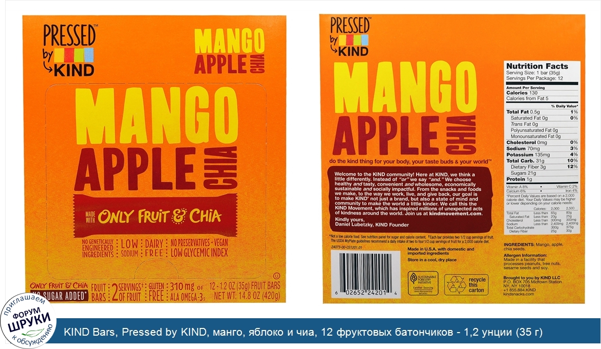 ru KIND Bars, Pressed by KIND, манго, яблоко и чиа, 12 фруктовых батончиков - 1,2 унции (35 г)
