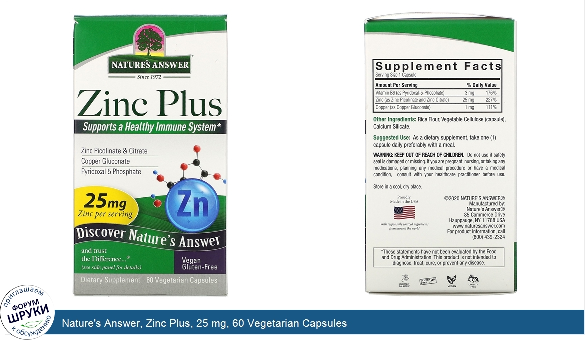 [DESCRIPT]Since 1972. Supports a Healthy Immune System. Zinc Picolinate Citrate. Copper Gluconate. Pyridoxal 5 Phosphate. Vegan. Gluten-Free. Dietary Supplement. Holistically Balanced. Cruelty Free. Supports a Healthy Immune System. Contains Vitamin B6 as Active Pyridoxal 5 Phospate. Contains Copper Gluconate. No Magnesium Stearate or Gelatin. Vegetarian. Nature's Answer® is proud to offer Zinc Plus, as part of its repertoire of immune support supplements. Zinc is a mineral that can be supplied by the diet and is intimately linked to immune support. Copper helps a variety of enzymes to function properly, and is a necessary nutrient for proper immune support. Vitamin B6 supports the body's use of minerals including Zinc. In addition Vitamin B6 has its own role in maintaining a healthy immune system. Discover Nature's Answer and trust the Difference.®. The Trust Nature of Our Standards goes way beyond the herb.™. A Trusted, Ethical, Family-Owned and Operated Business since 1972. We perform over 100 quality check points in every bottle. Our facility is cGMP Certified which requires us to follow Good manufacturing practices, assuring you that this product was made to the highest standards. Vertically Integrated-From the handpicked raw ingredients to the final product on shelf, we control every aspect of production in our state-of-the-art laboratory and production facility. It's your assurance that you're are getting the safest, most effective products made to the highest standards possible.[/DESCRIPT]... (описание дополняется)