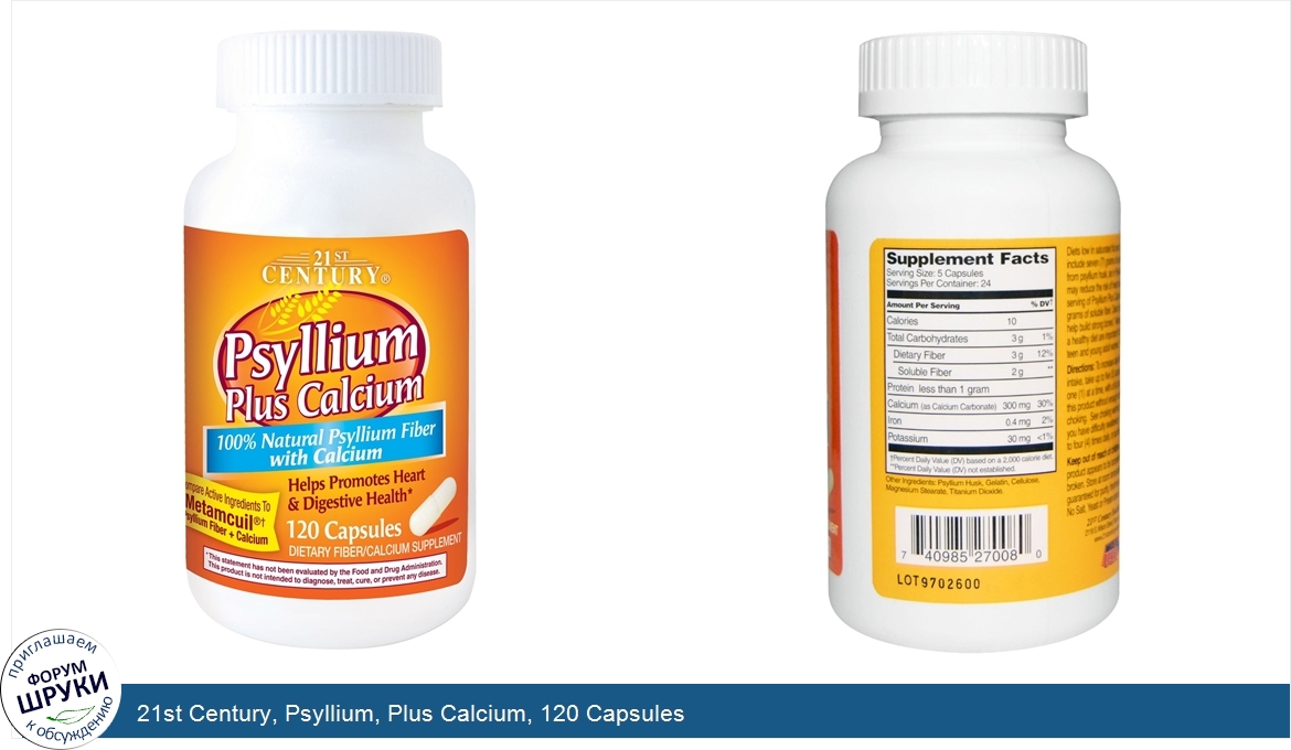 Друзья, если у вас есть отзыв/дополнение/комментарий/вопрос относительно 21st Century, Psyllium, Plus Calcium, 120 Capsules - напишите его ответом в эту тему (это будет полезно всему сообществу в целом и вам в отдельности).