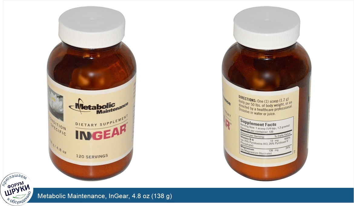 Друзья, если у вас есть отзыв/дополнение/комментарий/вопрос относительно Metabolic Maintenance, InGear, 4.8 oz (138 g) - напишите его ответом в эту тему (это будет полезно всему сообществу в целом и вам в отдельности).