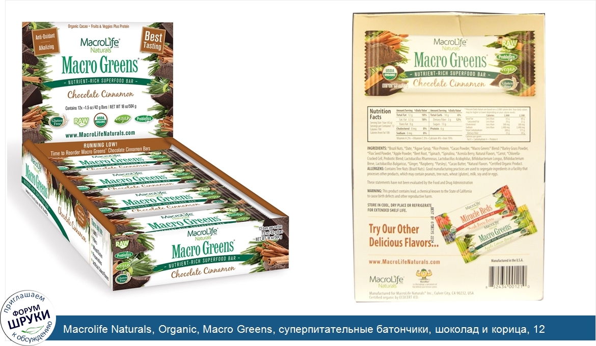 Друзья, если у вас есть отзыв/дополнение/комментарий/вопрос относительно Macrolife Naturals, Organic, Macro Greens, суперпитательные батончики, шоколад и корица, 12 батончиков по 1,5 унции (42 г) каждый - напишите его ответом в эту тему (это будет полезно всему сообществу в целом и вам в отдельности).