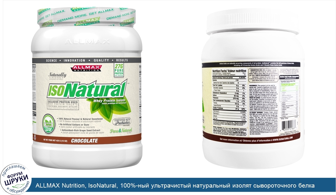 [DESCRIPT]Наука · Инновации · Качество · Результаты. 27 г чистого белка на порцию. Натуральные вкусовые добавки. Эксклюзивный источник протеина - изолят сывороточного белка. 100% натуральные ароматизаторы и подсластители. Без искусственных красителей. Богатый антиоксидантами экстракт виноградных косточек. 100% натуральные подсластители - стевия и архат. Усилено пробиотиками. Чистый и натуральный продукт. Изготовлено на производстве, сертифицированном по cGMP. Не содержит глютена. 100% гарантия качества и эффективности. Все аминокислоты встречаются в природе в белках. IsoNatural содержит полный спектр аминокислот, включая 9 незаменимых аминокислот и 3 аминокислоты с разветвленной цепью. Чистый, натуральный и вкусный протеин. IsoNatural - Источник чистого и качественного 100% сывороточного протеина с потрясающим вкусом чистых и натуральных ароматизаторов и подсластителей. Вы не должны довольствоваться малым, и мы никогда не пойдем по пути компромиссов! IsoNatural - это ультрачистый сывороточный протеин, подслащенный растительными экстрактами стевии и архата, без каких-либо искусственных красителей или ароматизаторов. IsoNatural содержит 27 г чистого (биоактивного) протеина в каждой порции. Прием IsoNatural - это отличный способ повысить содержание белка в вашем рационе. IsoNatural усилен NutraFlora - уникальным запатентованным пребиотиком, улучшающим усвоение кальция, укрепляющим иммунитет и пищеварение. Мы дополнительно усилили нашу формулу с помощью двух дополняющих другу друга и дающих синергетический эффект антиоксидантов, экстракта виноградных косточек и экстракта ягод ацеролы. Два этих антиоксиданта обеспечивают защиту от повреждающих клетки свободных радикалов, снабжая организм 15% от потребности организма в натуральном и биодоступном витамине C. IsoNatural легко смешивать, это вкусный, удобный и простой способ добавления в ваш рацион высококачественного сывороточного протеина. IsoNatural не содержит жир и сахар и на 99% свободен от лактозы. IsoNatural отличается выдающимся качеством протеина с самой высокой биологической ценностью, проще говоря, ваш организм будет усваивать сывороточный протеин лучше любой другой формы протеина. IsoNatural также не содержит искусственных подсластителей. Усилен. пребиотиком NutraFlora,. богатым витамином С экстракт ягод вишни ацеролы,. богатым антиоксидантами экстракт виноградных косточек. Улучшает работу системы пищеварения. Поддерживает здоровое состояние костей. Улучшает состояние кишечника. Гарантия качества Allmax: Allmax IsoNatural производится на производственном объекте с сертификатами cGMP, NHP и HACCP, что обеспечивает качество и сохранность продукции. Все добавленные ингредиенты и каждая произведенная партия проходят независимые лабораторные испытания на чистоту и эффективность действия. Тем самым гарантируется единообразное постоянное качество в любой момент времени. Технология холодной обработки [CTP]: . Наш эксклюзивный низкотемпературный процесс обеспечивает поистине уникальную технологию извлечения белка, которая сохраняет чистые белковые фракции в их естественном состоянии, тем самым устраняя необходимость в использовании агрессивных химикатов и денатурации. Этот процесс позволяет IsoNatural обеспечивать исключительно высокую отдачу белка при сохранении важнейших биологически активных компонентов и необычайных белковых микрофр