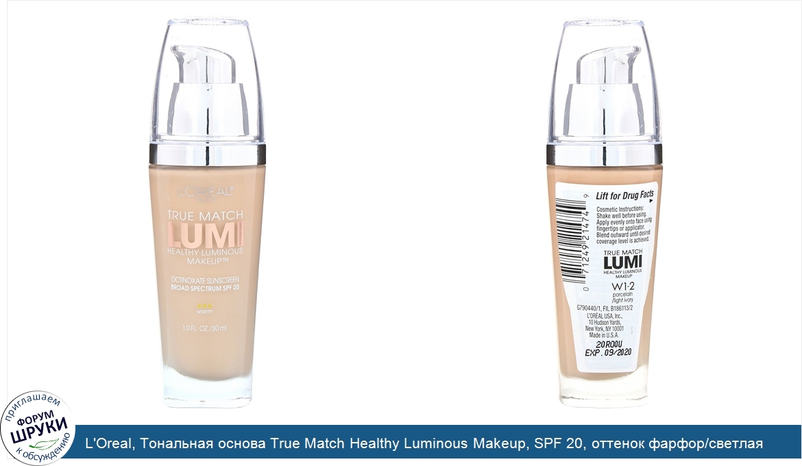 ru L'Oreal, Тональная основа True Match Healthy Luminous Makeup, SPF 20, оттенок фарфор/светлая слоновая кость W1-2, 30мл