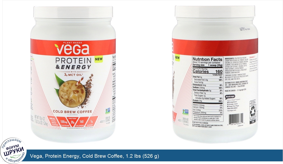 [DESCRIPT]Plant-Based. Real Cold Brew Coffee. 100 mg Caffeine*. Protein* 20 g. 160 Calories*. 1 g Sugar*. Non-GMO Project Verified. Drink Mix. About 15 Servings. Certified B Corporation. Made with Real Plant-Based Food Ingredients. With Plant-Based Protein and Caffeine from coffee fruit, Vega Protein Energy is the edge you need to power forward. We believe in foods made with plant-based ingredients. That's why we chose to use medium chain triglycerides, which are quickly absorbed fatty acids extracted from coconut. When crafted into MCT oil, those fats become readily available for your body to use. Deliciously Smooth. The Vega Protein Energy Promise. Gluten Free. Certified Vegan. No Added Sugar. No Artificial Colors, Flavors, or Preservatives. *Per Serving.[/DESCRIPT]... (описание дополняется)