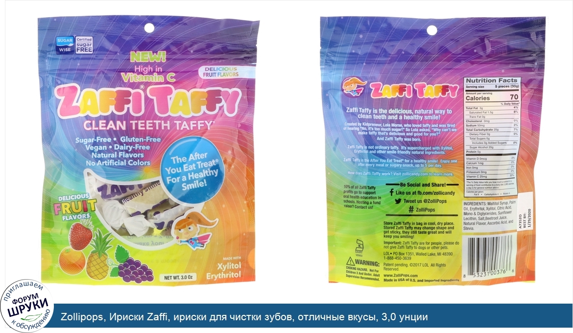 [DESCRIPT]Sugar Wise. Отсутствие сахара сертифицировано. Не содержит глютена. Веганский продукт. Не содержит молочных продуктов. Натуральные вкусы. Без искусственных красителей. Вкусное лакомство после еды для здоровой улыбки! . С ксилитолом и эритритолом. Кошерный молочный продукт. Zaffi Taffy – это вкусный, естественный способ для очистки зубов и здоровой улыбки! Придумано Лолой Морс из Kidpreneur, которая любила ириски и устала слушать, что в них слишком много сахара. Лола задалась вопросом, почему же не сделать ириски такими же вкусными и полезными. Так появились Zaffi Taffy. Zaffi Taffy – это не просто ириски. Они обогащены ксилитолом, эритриолом и другими полезными натуральными ингредиентами для здоровой улыбки. Zaffi Taffy – вкусное лакомство после еды для здоровой улыбки! Съедайте по одной штуке после каждого приема пищи или сладкого перекуса, до 5 штук в день.[/DESCRIPT]... (описание дополняется)