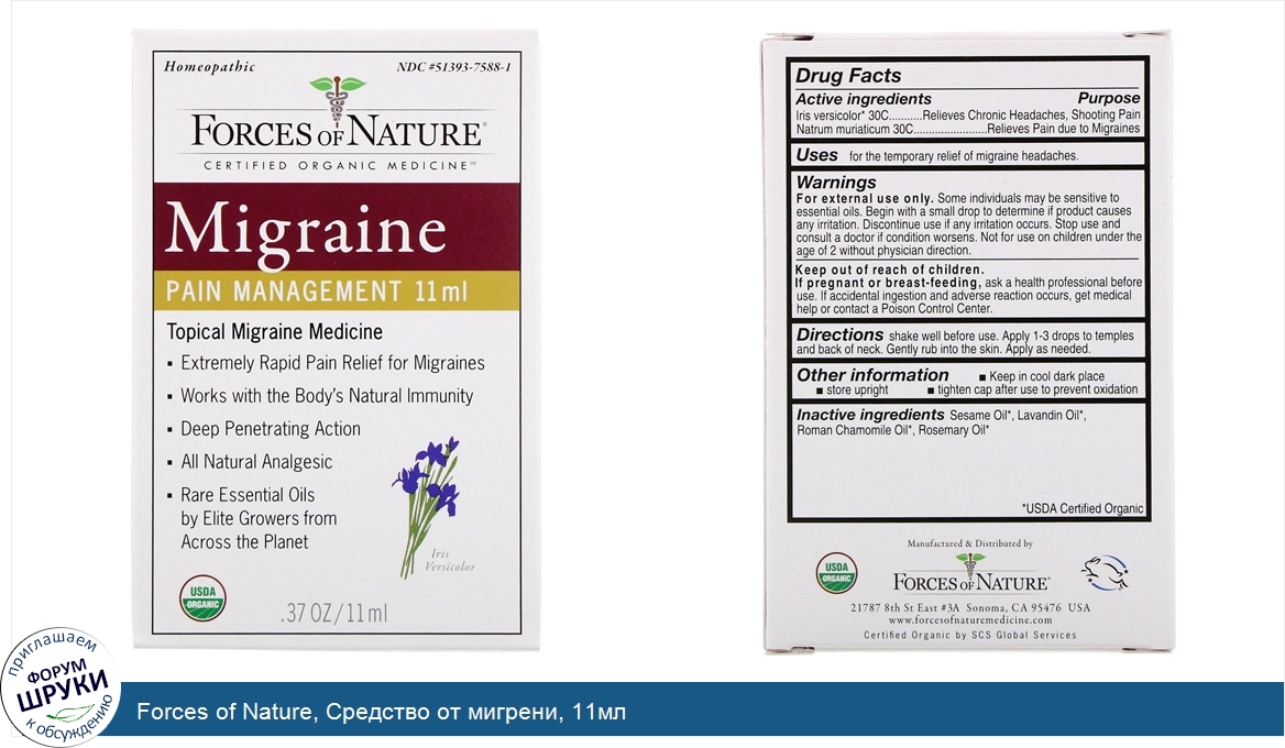 [DESCRIPT]Powerful Medicine Prescribed by Nature. USDA Organic. Guaranteed Results. Homeopathic. Certified Organic Medicine. Pesticide Free. Toxin Free. GMO Free. Vegan. Gluten Free. Cruelty Free. Certified Organic by SCS Global Services. Uses: . For the temporary relief of migraine headaches. Topical Migraine Medicine. Extremely rapid pain relief for migraines. Works with the body's natural immunity. Deep penetrating action. All natural analgesic. Rare essential oils by elite growers from across the planet. The Power of Purple Iris and Sodium Chloride. This potent combination works quickly to relieve stabbing / throbbing pain caused by migraines. Anti-inflammatory action provides soothing and calming results often experienced within minutes after application. Migraine Pain Management. Our unique dual action approach to healing Migraines is fast acting and therapeutic. We blend homeopathic medicines which activate immune parameters and help balance the system with certified organic essential oils which are soothing, calming, and nourishing. This dual modality approach provides fast, effective relief for migraine pain. Helps reduce both the pain and the sickness, especially if used in the early stages. Powerful Medicine Prescribed by Nature. Forces of Nature proudly provides powerful organic medicines which deliver results time after time. Our organic medicinal plant extracts are sourced from elite growers from all over the planet. This includes high in the Himalayan, Andes, and Rocky Mountains; Madagascar; the islands of Java and Corsica; and pristine locations in California. We provide the ultimate in purity and therapeutic value for our treatments and customers. These are the world's first line of USDA organic medicines and proudly made in the USA.[/DESCRIPT]... (описание дополняется)