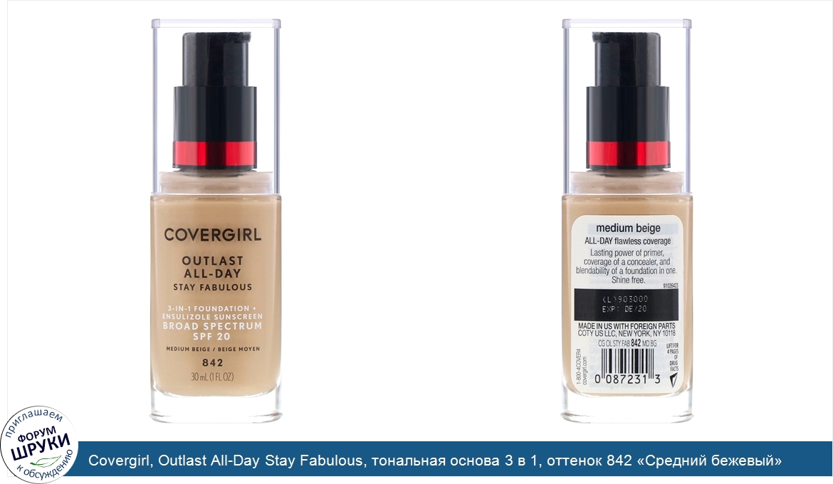 Covergirl, Outlast All-Day Stay Fabulous, тональная основа 3 в 1, оттенок 842 «Средний бежевый», 30мл (1 жидк.унция)