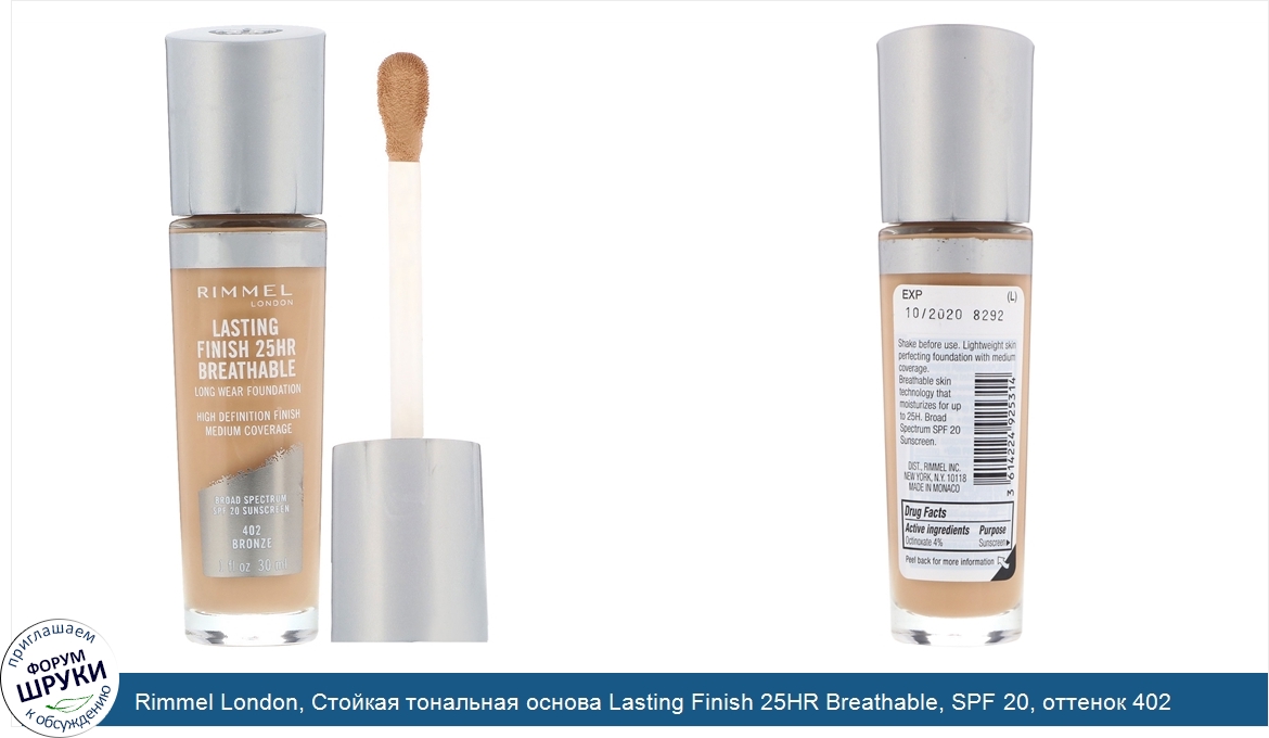 Rimmel London, Стойкая тональная основа Lasting Finish 25HR Breathable, SPF 20, оттенок 402 бронзовый, 30 мл