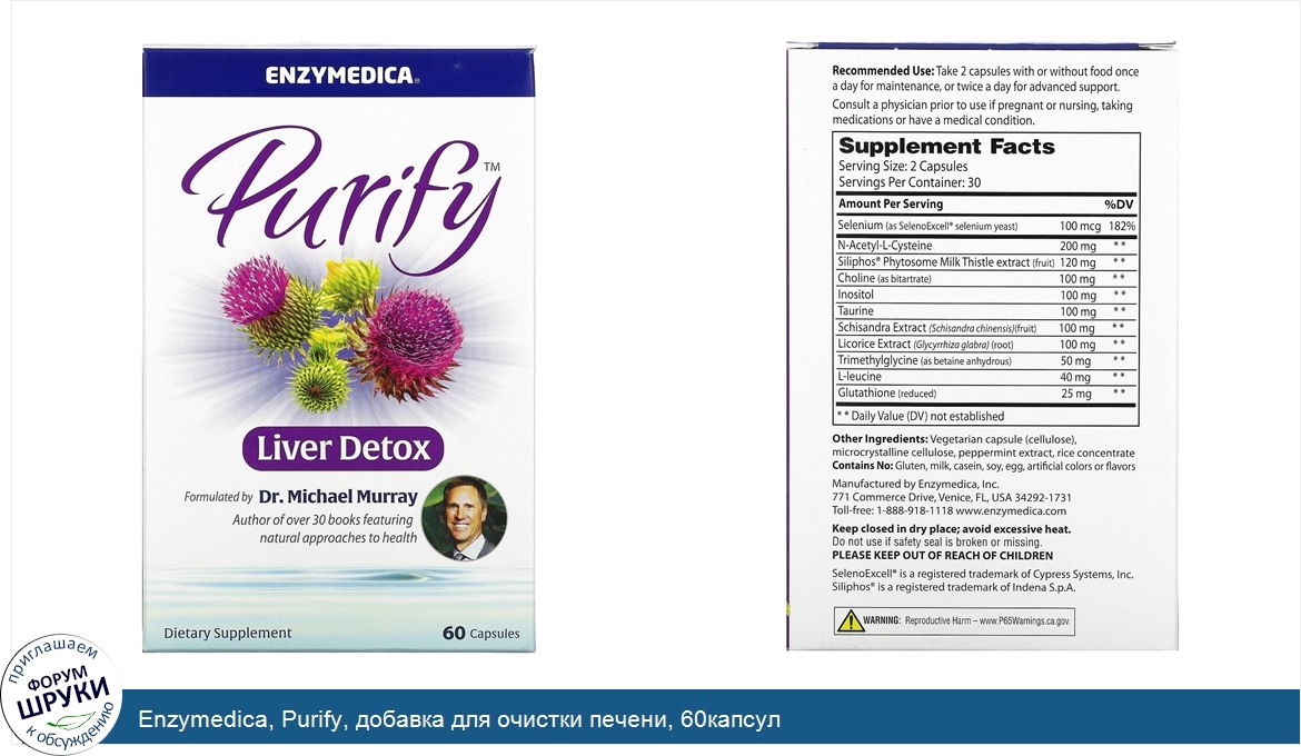 [DESCRIPT]Purify Your Life. ™. Dietary Supplement. Gluten Free. Dairy Free. Non GMO. Vegan. Soy Free. Formulated by Dr. Michael Murray - Author of over 300 books featuring natural approaches to health. Purify. ™. Liver Detox provides unparalleled support for liver detoxification and function. Many natural ingredients are well known for their ability to support the liver. Purify. ™. takes these ingredients one step further by using premium ingredients like Siliphos®. and SelenoExcell. ®, which have been shown to provide benefits superior to standard ingredients. Additional complimentary ingredients are provided at therapeutic levels to offer comprehensive support for all stages of detoxification. Premium Ingredients. N-Acetyl-Cysteine boosts glutathione levels, a critical detoxification agent and antioxidant. Siliphos® A unique "phytosome" form of milk thistle extract. Compared to regular milk thistle extracts, Siliphos exerts greater absorption and efficacy in protecting the liver and aiding its structure and function. SelenoExcell® A natural food form of selenium, which is a key component of the detoxifying enzyme glutathione peroxidase, which can assist the body in reducing oxidative stress. Additional complementary ingredients like choline, taurine, licorice extract and schisandra extract are included to provide critical nutrients to support liver function.[/DESCRIPT]... (описание дополняется)