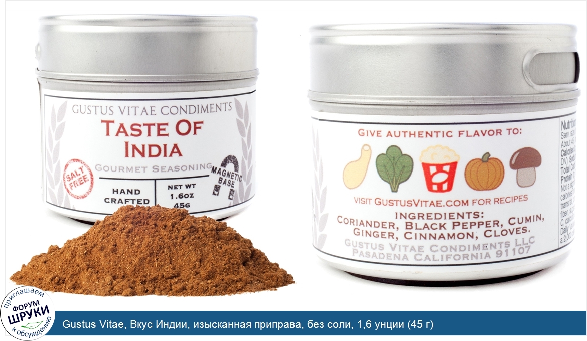 Друзья, если у вас есть отзыв/дополнение/комментарий/вопрос относительно Gustus Vitae, Вкус Индии, изысканная приправа, без соли, 1,6 унции (45 г) - напишите его ответом в эту тему (это будет полезно всему сообществу в целом и вам в отдельности).