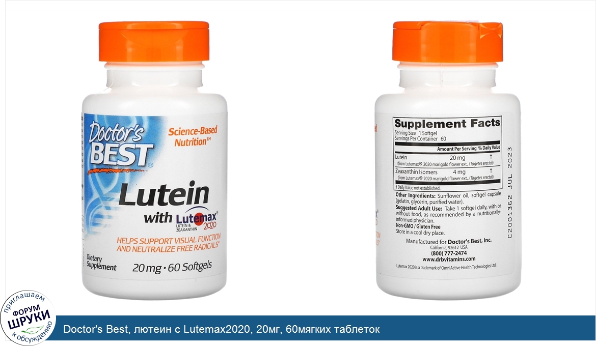 Друзья, если у вас есть отзыв/дополнение/комментарий/вопрос относительно Doctor's Best, лютеин с Lutemax2020, 20мг, 60мягких таблеток - напишите его ответом в эту тему (это будет полезно всему сообществу в целом и вам в отдельности).