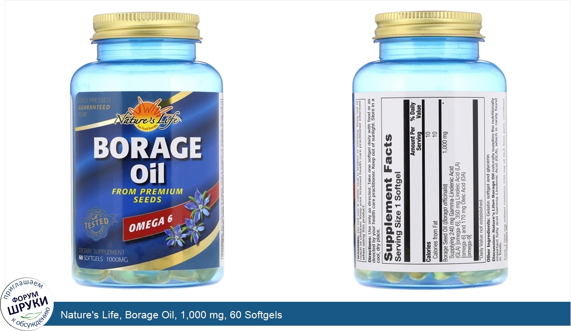 [DESCRIPT]Sun Food Energy. From Premium Seeds. Omega-6. Third Party Tested. Dietary Supplement. Cold Pressed. Guaranteed Pure. Discussion: Nature's Life Borage Oil naturally supplies the nutritionally important fatty acid Gamma-Linolenic Acid (GLA), which is rarely found in foods. Each 1,000 mg softgel contains 240 mg of GLA from pure, unrefined borage seed oil.[/DESCRIPT]... (описание дополняется)