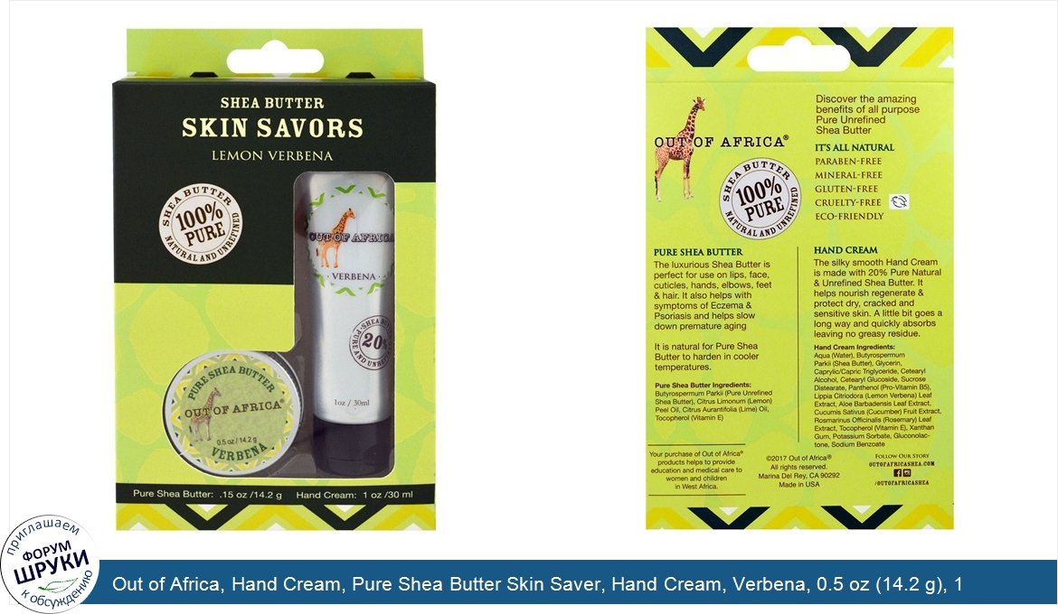 Out of Africa, Hand Cream, Pure Shea Butter Skin Saver, Hand Cream, Verbena, 0.5 oz (14.2 g), 1 oz (30 ml)