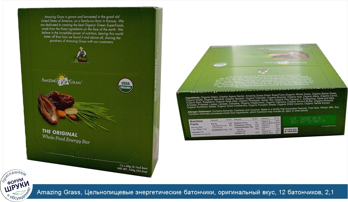 Друзья, если у вас есть отзыв/дополнение/комментарий/вопрос относительно Amazing Grass, Цельнопищевые энергетические батончики, оригинальный вкус, 12 батончиков, 2,1 унции (60 г) каждый - напишите его ответом в эту тему (это будет полезно всему сообществу в целом и вам в отдельности).