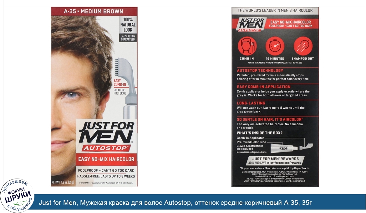 Друзья, если у вас есть отзыв/дополнение/комментарий/вопрос относительно Just for Men, Мужская краска для волос Autostop, оттенок средне-коричневый A-35, 35г - напишите его ответом в эту тему (это будет полезно всему сообществу в целом и вам в отдельности).