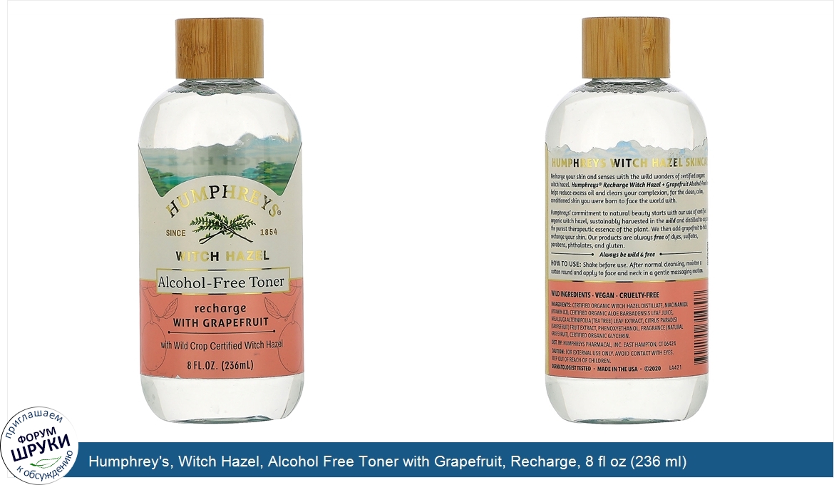 [DESCRIPT]Since 1854. USDA Organic. With Wild Crop Certified Witch Hazel. Always be Wild Free. Wild Ingredients. Vegan. Cruelty-Free. Certified Organic by QAI. Dermatologist Tested. Humphreys Witch Hazel Skincare. Recharge your skin and senses with the wild wonders of certified organic witch hazel. Humphreys® Recharge Witch Hazel + Grapefruit Alcohol -free toner helps reduce excess oil and clears your complexion, for the clean, calm, conditioned skin you were born to face the world with. Humphreys' commitment to natural beauty start with our use of certified organic witch hazel, sustainably harvested in the wild and distilled to capture the purest therapeutic essence of the plant. We then add rose to soothe your skin and delight your senses. Our products are always free of dyes, sulfates, parabens, phthalates, and gluten.[/DESCRIPT]... (описание дополняется)