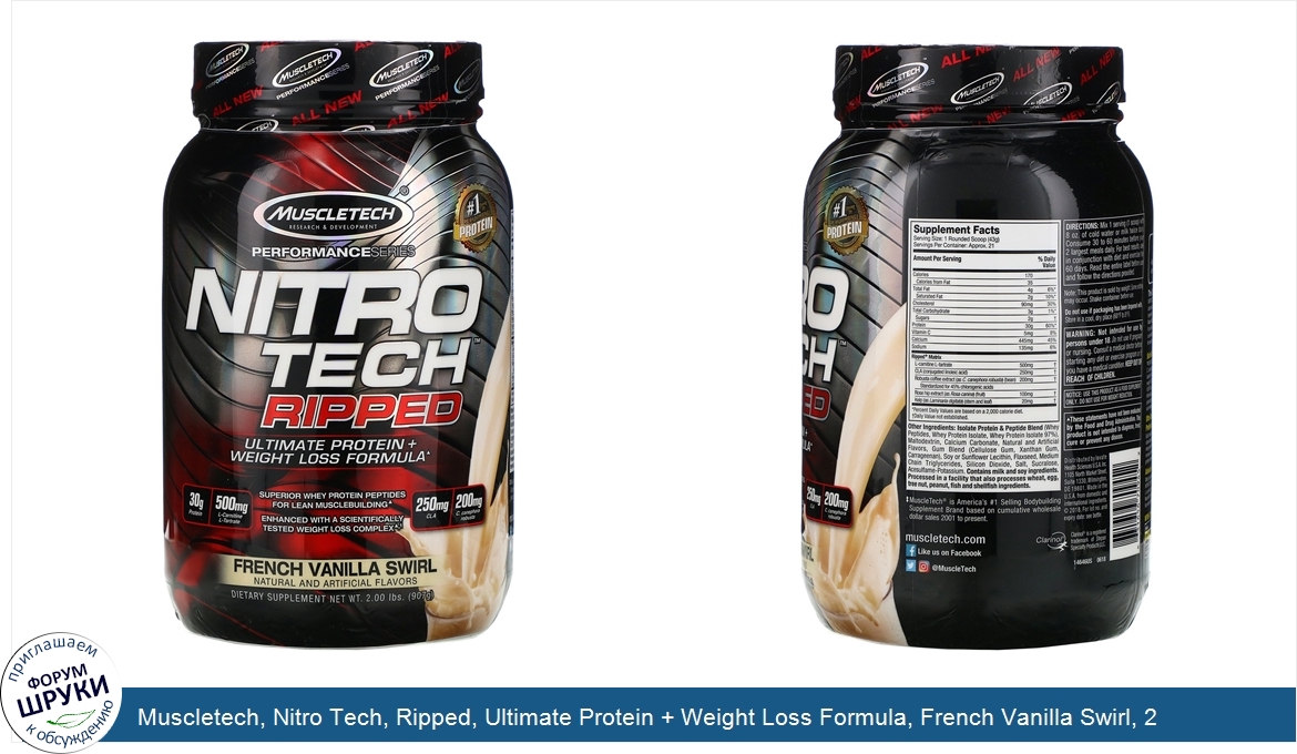 Muscletech, Nitro Tech, Ripped, Ultimate Protein + Weight Loss Formula, French Vanilla Swirl, 2 lbs (907 g)