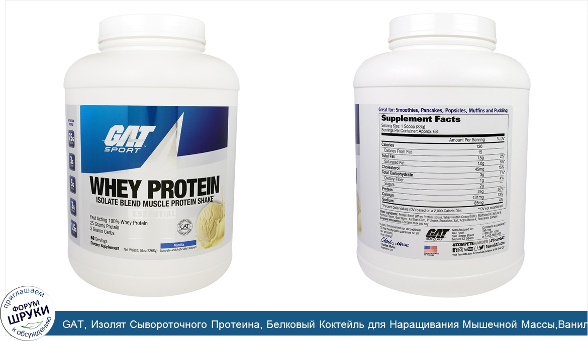 GAT, Изолят Сывороточного Протеина, Белковый Коктейль для Наращивания Мышечной Массы,Ваниль, 5 унций (2268 г)