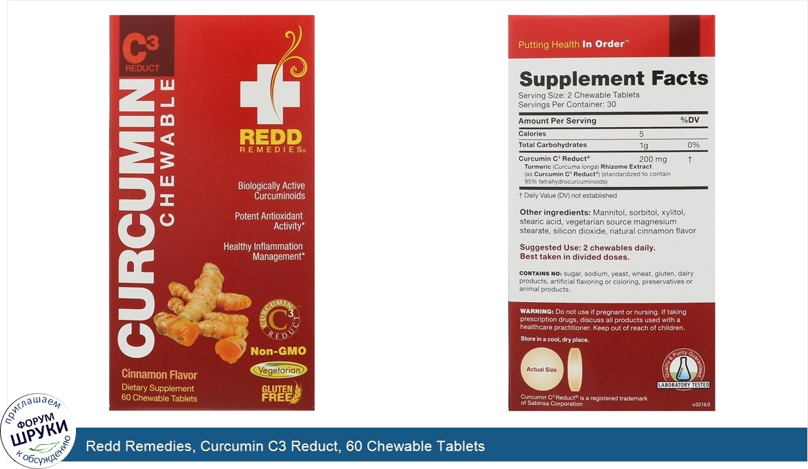 Друзья, если у вас есть отзыв/дополнение/комментарий/вопрос относительно Redd Remedies, Curcumin C3 Reduct, 60 Chewable Tablets - напишите его ответом в эту тему (это будет полезно всему сообществу в целом и вам в отдельности).