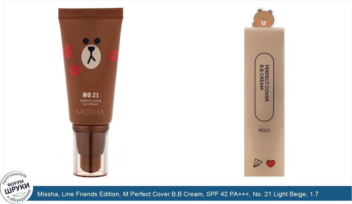 Друзья, если у вас есть отзыв/дополнение/комментарий/вопрос относительно Missha, Line Friends Edition, M Perfect Cover B.B Cream, SPF 42 PA+++, No. 21 Light Beige, 1.7 oz (50 ml) - напишите его ответом в эту тему (это будет полезно всему сообществу в целом и вам в отдельности).
