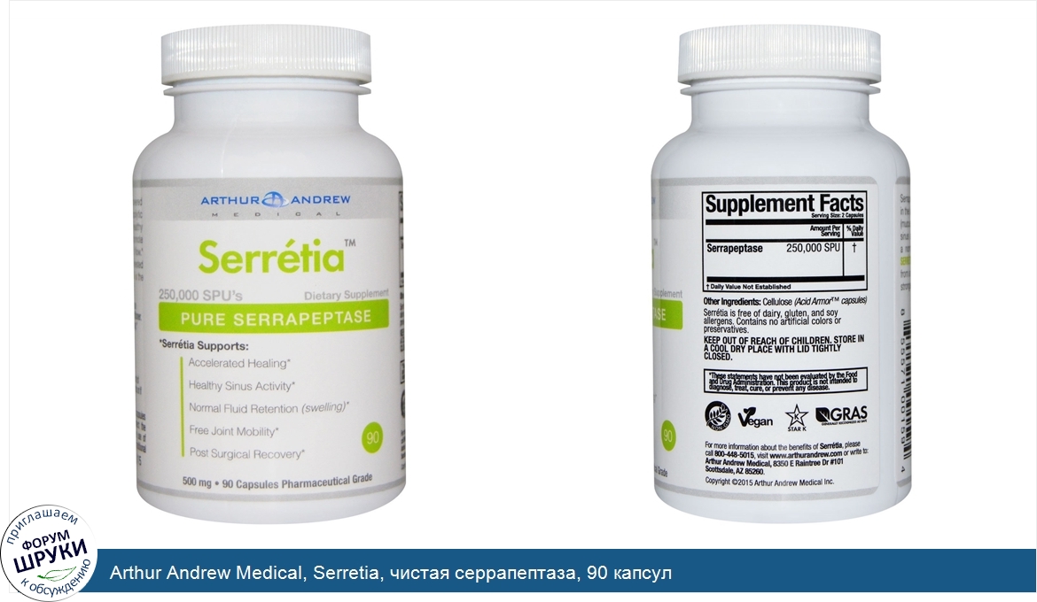 ru Arthur Andrew Medical, Serretia, чистая серрапептаза, 90 капсул