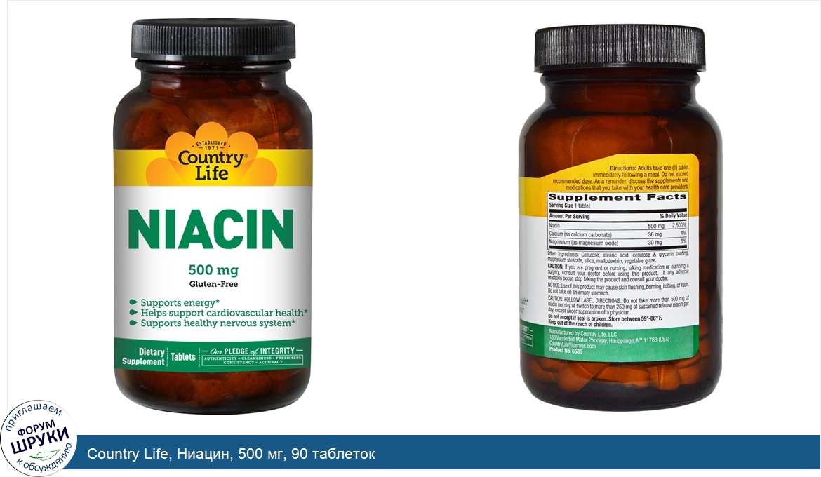 Country Life, Ниацин, 500 мг, 90 таблеток