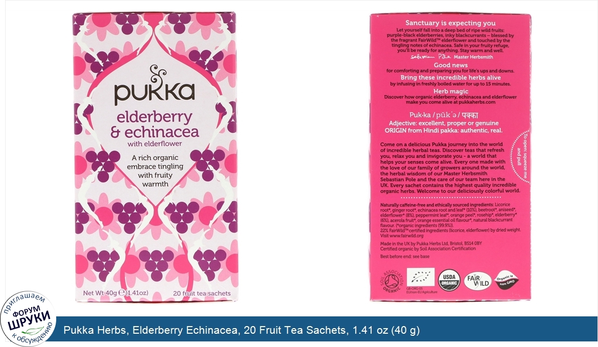 Друзья, если у вас есть отзыв/дополнение/комментарий/вопрос относительно Pukka Herbs, Elderberry Echinacea, 20 Fruit Tea Sachets, 1.41 oz (40 g) - напишите его ответом в эту тему (это будет полезно всему сообществу в целом и вам в отдельности).