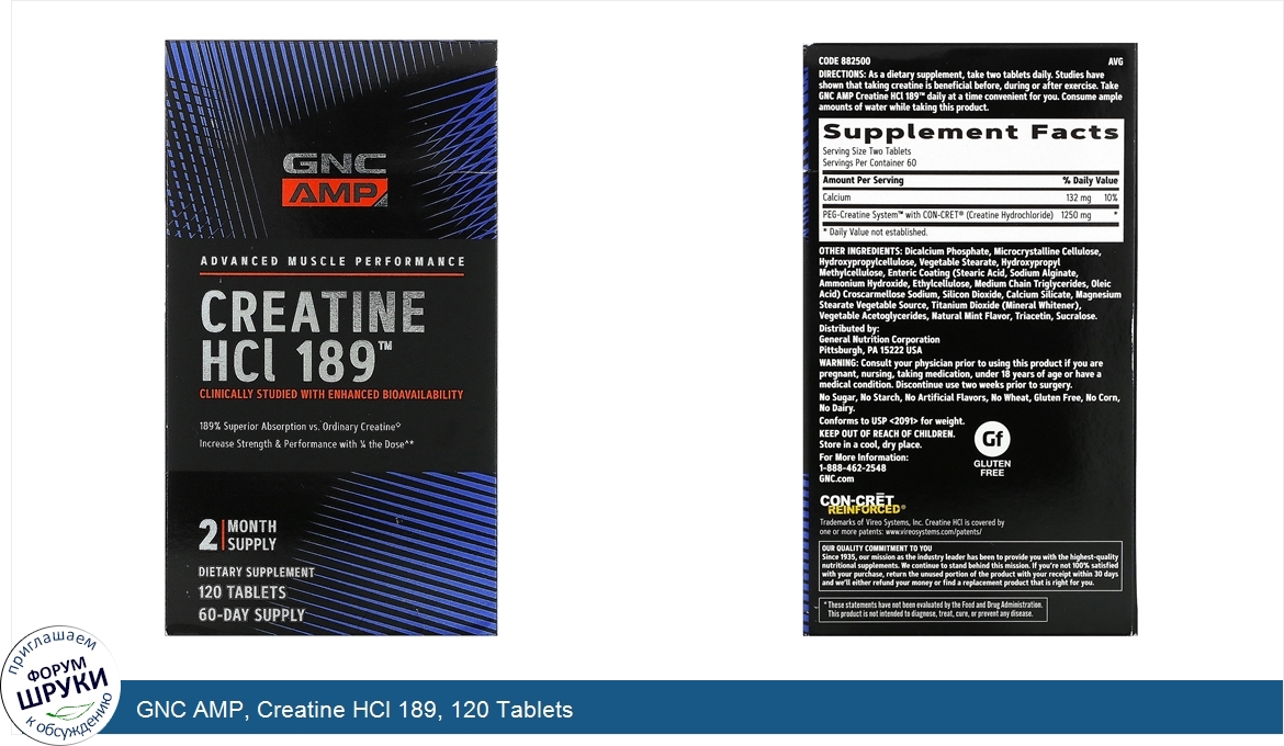 [DESCRIPT]Advanced Muscle Performance. Clinically studied with Enhanced Bioavailability. 189% Superior Absorption vs. Ordinary Creatine. ◇. Increase Strength Performance with 1/4 The Dose^. 2 Month Supply. Dietary Supplement. Fuel Your Muscle Creatine Uptake 189% More Efficiently. ◇. Gluten Free. CON-CRET REINFORCED®. Move 9.5x More Weight^. Clinically Proven Efficiency^◇. Delivering 189% superior muscle creatine uptake, GNC AMP Creatine HCI 189™ is clinically proven to get into your muscle and improve strength performance more efficiently than creatine monohydrate.^◇. Superior Absorption Bioavailability◇. The power of 5 grams of creatine in only two easy-to-swallow tablets.^ This creatine HCl, containing 1.25 grams of a PEG-Creatine, improved leg press and bench press performance just as well as 5 grams of creatine monohydrate.^. Take Less Get More. The PEG-Creatine System™ is a proprietary formula with a patent-pending technology that allows you to get the same benefits as creatine monohydrate at a much lower dose^. If it's on our boxes, then it's in our bottles. Full dosing, full transparency and no proprietary blends. Clinically studied ingredients backed by real science. Get superior power and strength. ^In a randomized, double-blind clinical study of 57 healthy, young adult males, subjects who took GNC AMP Creatine HCI 189™ containing only 1.25 grams of the PEG-Creatine System™ significantly improved leg press 1-RM performance by 54.3 lb., while subjects receiving 5 grams of creatine monohydrate significantly improved performance by 52.3 lb., and the placebo group showed no significant improvement at 5.7 lb. at the end of the study. ◇. In a clinical study of 17 healthy, young adults, muscle biopsy results revealed that GNC AMP Creatine HCl 189™ resulted in 189% greater muscle creatine uptake relative to benchmark amounts of ordinary creatine monohydrate powder.[/DESCRIPT]... (описание дополняется)