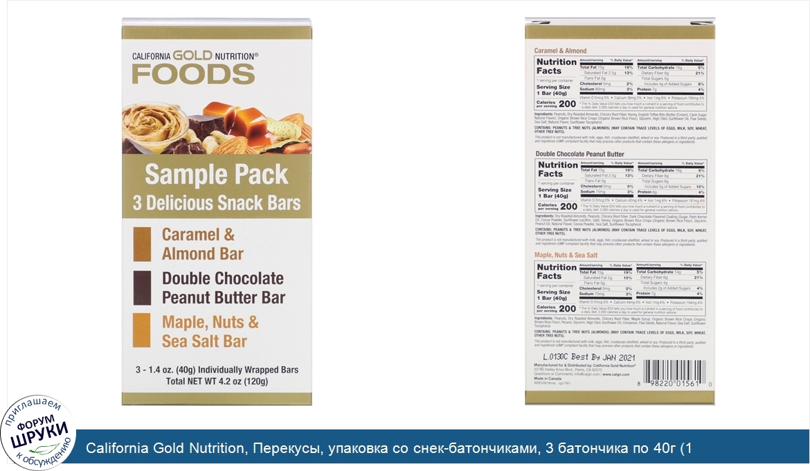 . California Gold Nutrition Foods. Упаковка со снек-батончиками. Батончик с карамелью и миндалем. Батончик с двойным шоколадом и арахисовым маслом. Батончик с кленовым сиропом, орехами и морской солью. Простые ин...