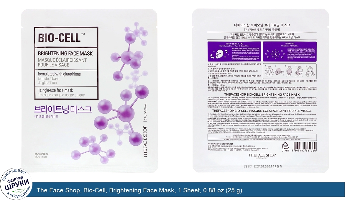 Друзья, если у вас есть отзыв/дополнение/комментарий/вопрос относительно The Face Shop, Bio-Cell, Brightening Face Mask, 1 Sheet, 0.88 oz (25 g) - напишите его ответом в эту тему (это будет полезно всему сообществу в целом и вам в отдельности).
