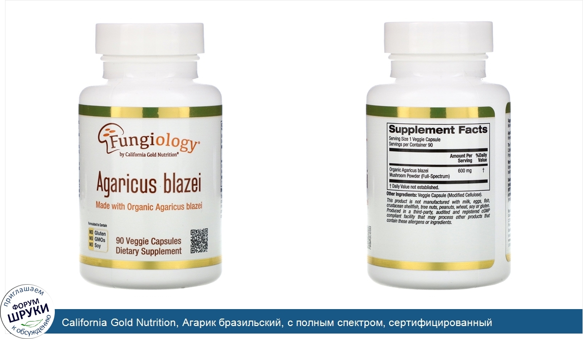 . Fungiology. Agaricus blazei. производства. California Gold Nutrition. Органические грибы полного спектра, культивируются в США. Органический продукт, сертифицированный компанией A Bee Organic. Подходит для веге...