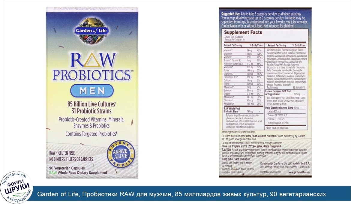 Друзья, если у вас есть отзыв/дополнение/комментарий/вопрос относительно Garden of Life, Пробиотики RAW для мужчин, 85 миллиардов живых культур, 90 вегетарианских капсул - напишите его ответом в эту тему (это будет полезно всему сообществу в целом и вам в отдельности).