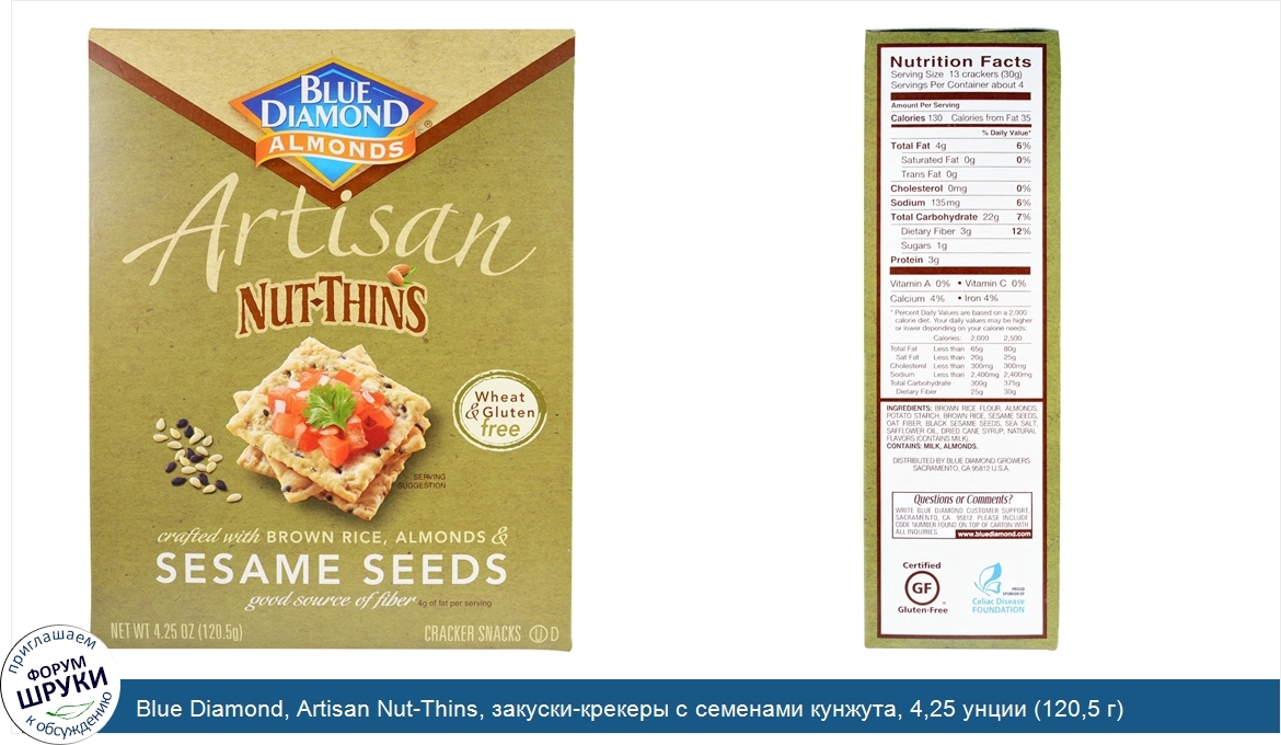 [DESCRIPT]Wheat Gluten Free. Crafted With Brown Rice and Almonds. Good Source of Fiber. 4 g of Fat Per Serving. Certified Gluten Free. The Delicious Gluten-Free Artisan Cracker. We think you'll agree these artisan-baked crackers go well with almost everything. Now you can enjoy the delicious taste of Blue Diamond Artisan Nut-Thins with the added tasty benefits of Sesame Seeds. We're sure they'll be your new favorite, guilt-free snack! Tasty Benefits per Serving. 3 g of Protein. 3 g of Fiber. 18 g of Whole Grain. 130 Calories for 13 Crackers. No Wheat or Gluten.[/DESCRIPT]... (описание дополняется)
