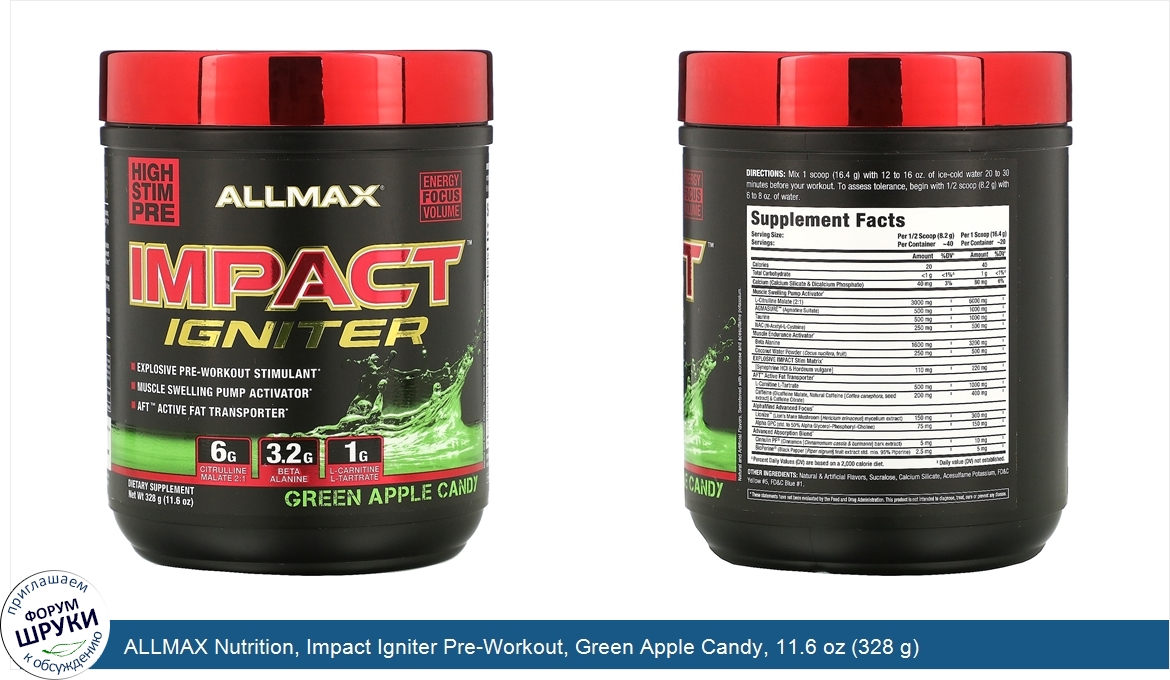 Друзья, если у вас есть отзыв/дополнение/комментарий/вопрос относительно ALLMAX Nutrition, Impact Igniter Pre-Workout, Green Apple Candy, 11.6 oz (328 g) - напишите его ответом в эту тему (это будет полезно всему сообществу в целом и вам в отдельности).