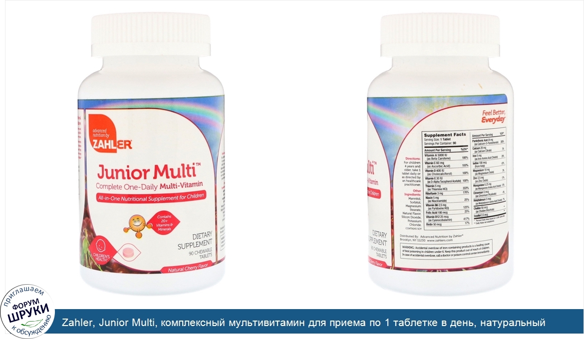 Друзья, если у вас есть отзыв/дополнение/комментарий/вопрос относительно Zahler, Junior Multi, комплексный мультивитамин для приема по 1 таблетке в день, натуральный вишневый вкус, 90 жевательных таблеток - напишите его ответом в эту тему (это будет полезно всему сообществу в целом и вам в отдельности).