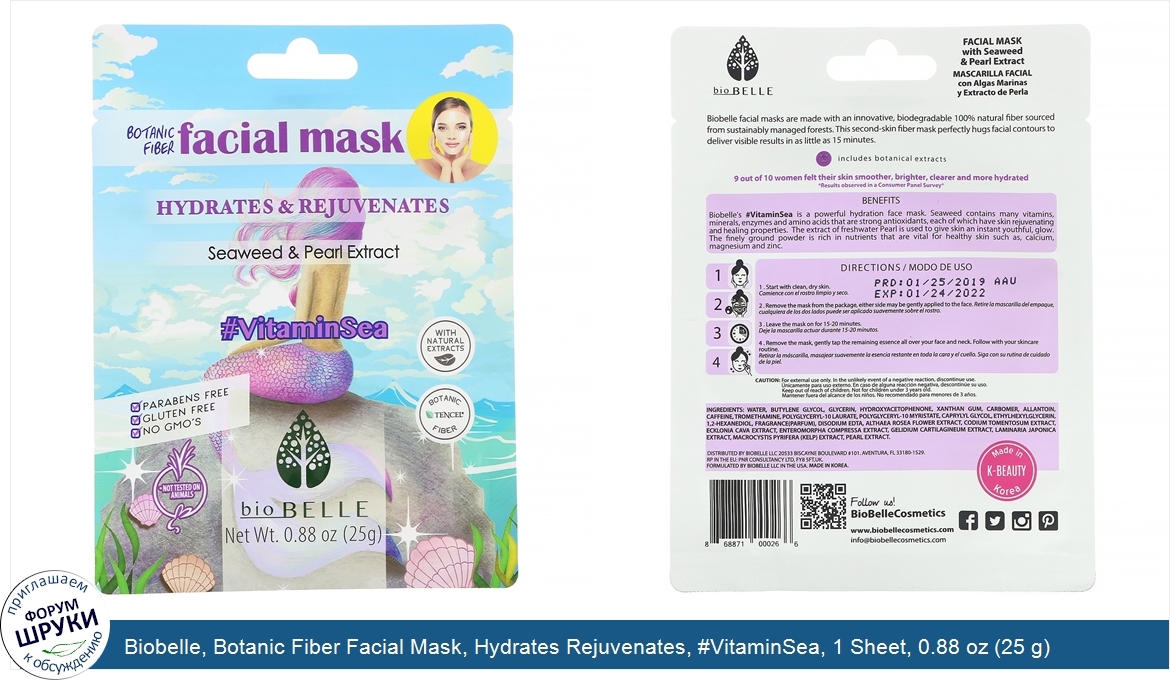 [DESCRIPT]Seaweed Pearl Extract. Parabens Free. Gluten Free. No GMO's. Not Tested on Animals. With Natural Extracts. Botanical TENCEL® Fiber. Includes Botanical Extracts. K-Beauty. Biobelle facial mask are made with an innovative, biodegradable 100% natural fiber sourced from sustainably managed forests. The second-skin fiber sourced from sustainably managed forests. This second-skin fiber mask perfectly hugs facial contours to deliver visible results in as little as 15 minutes. 9 out of 10 women felt their skin smoother, brighter, clearer and more hydrated. Benefits. Biobelle's #VitaminSea is a powerful hydration face mask. Seaweed contains many vitamins, minerals, enzymes and amino acids that are strong antioxidants, each of which have skin rejuvenating and healing properties. The extract of freshwater Pearl is used to give skin an instant youthful glow. The finely ground powder is rich in nutrients that are vital for healthy skin such as, calcium, magnesium and zinc.[/DESCRIPT]... (описание дополняется)